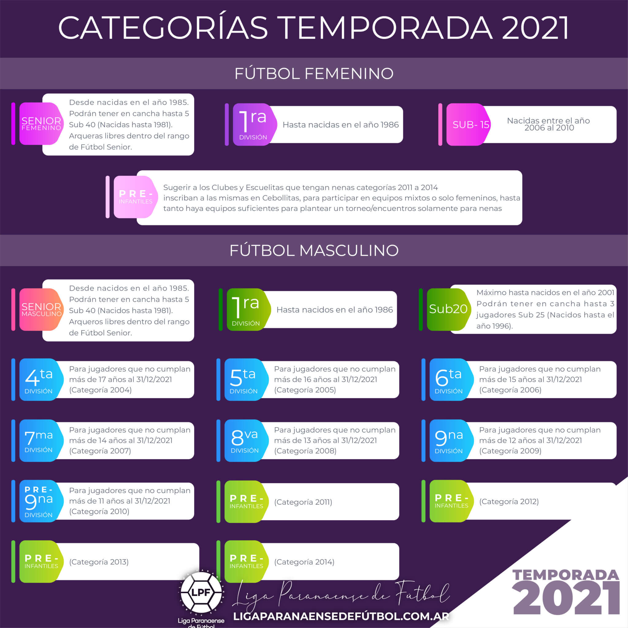 La LPF definió las categorías de la temporada 2021. El futbol masculino ira desde futbol senior hasta pre-infantiles. Mientras que la novedad está en la rama femenina, que contará con cuatro categorías: Senior, Primera, Sub-15 y Pre-Infantiles.