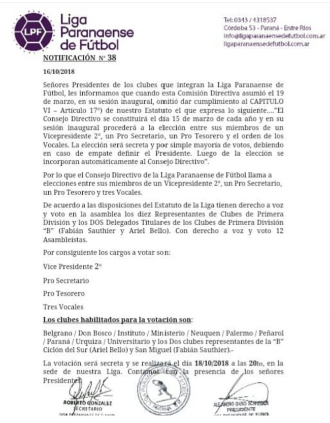 A menos de un mes de las sorpresivas renuncias del Vicepresidente Segundo, Pro-Secretario, Tesorero, Pro-Tesorero y tres vocales debido a diferencias políticas con sus pares, el ente regulador comunicó a los presidentes de los clubes mediante su boletín N° 38 el llamado a elecciones para este jueves 18/10.