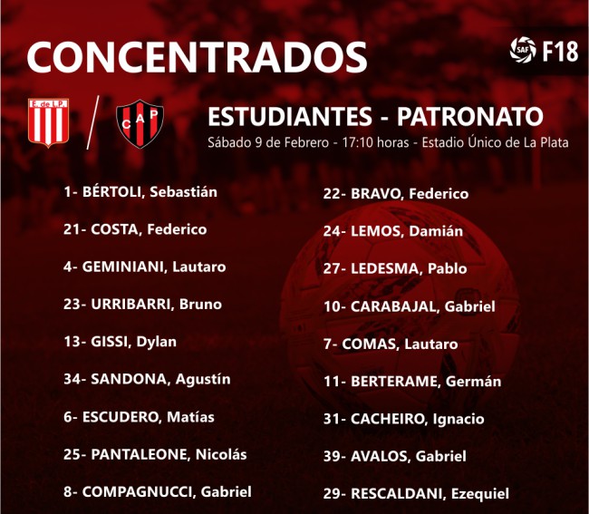 El cuerpo técnico encabezado por Mario Sciacqua dio a conocer la lista de 18 concentrados que viajarán este jueves a La Plata para enfrentar a Estudiantes el fin de semana. Hay modificaciones obligadas y otras por razones futbolísticas.
