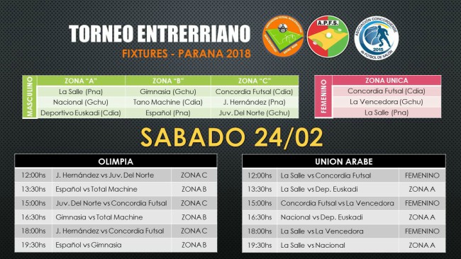 Por el lado femenino, el certamen cuenta con una única zona, con Concordia Futsal, La Vencedora (Gualeguaychú) y La Salle (Paraná). Desde el mediodía del sábado en la Unión Árabe las chicas comenzarán a rodar la pelota. El primero en la tabla esperará en la final.